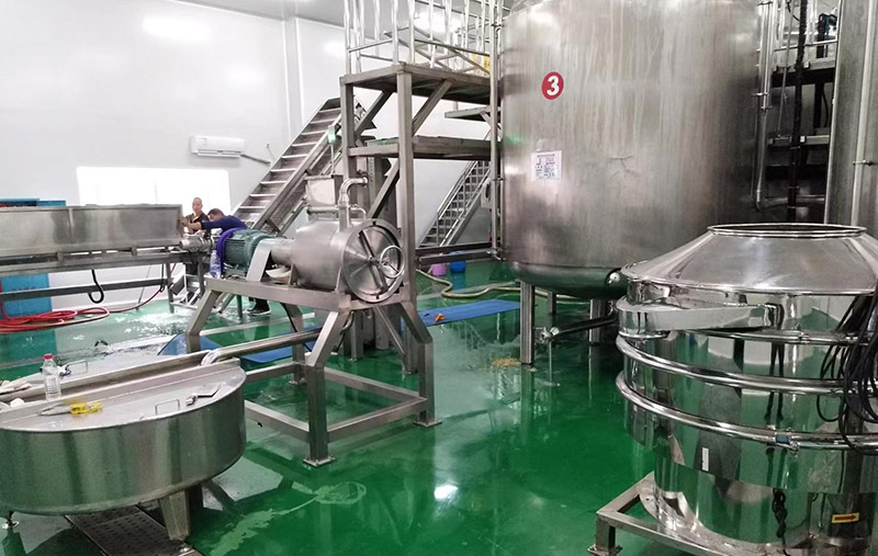 (3)破碎:這道工序是關係到番茄汁粘稠度的重要。工序,有熱破碎和冷破碎兩種方法。一般生產都應用熱破碎,一方麵出汁率高,另一方麵酶鈍化快,番茄汁的粘度較高,果汁不易分層 ,但熱破碎溫度和時間的不同,對番茄汁的粘度還有很大的影響,而粘度又是影響果汁穩定性及風味的重要因素。